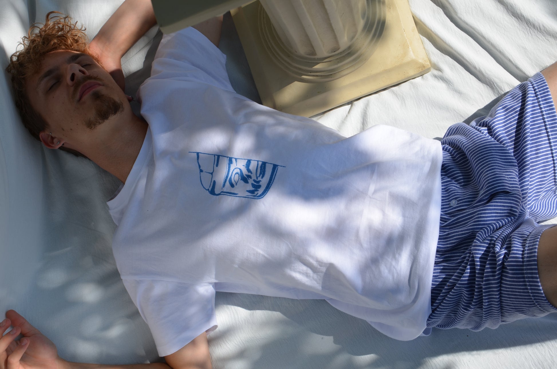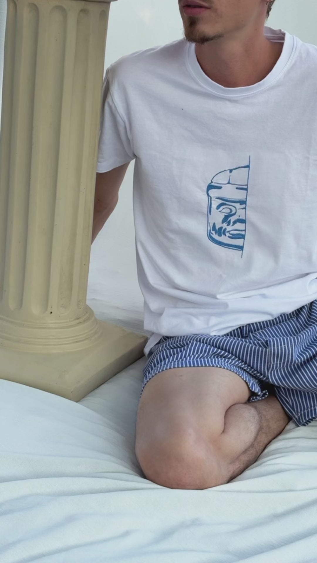 “This drawing was born in a notebook several years ago. Inspired by the Olmec colossi of Mexico, it tells the story of past civilizations. Today, it is embroidered on a t-shirt, like a fragment of memory to be worn.”